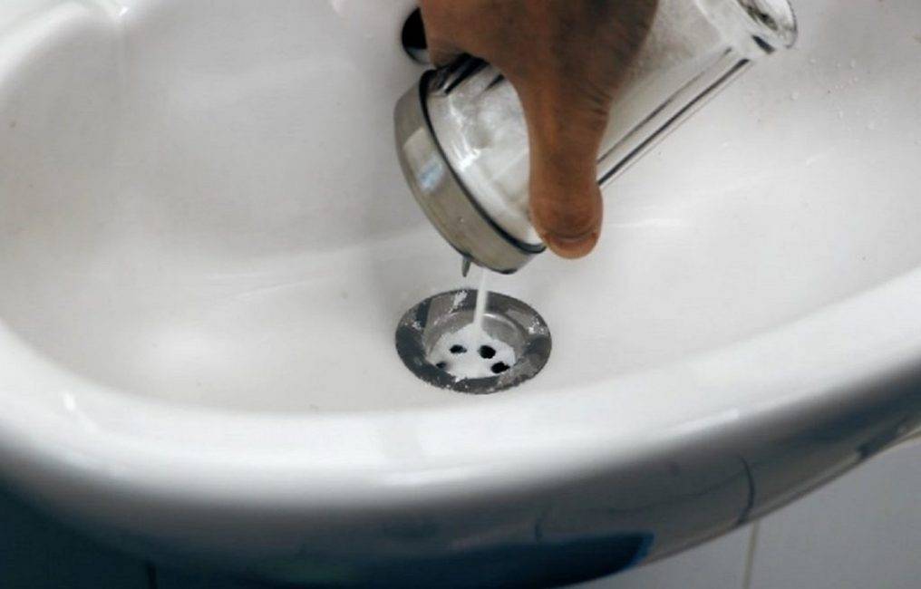 - сода и уксус. В сливное отверстие необходимо засыпать 200 г пищевой соды, следом залить туда же полный стакан 9% уксуса. Дождаться окончания химической реакции, для этого потребуется около 10 минут, и хорошо промыть сливную трубу большим напором горячей воды. Во время химической реакции выделяется углекислый газ, поэтому требуется хорошо проветрить помещение;
