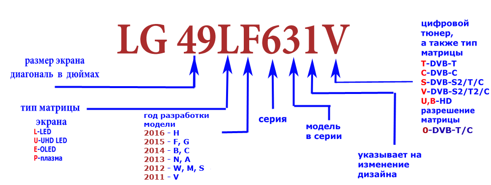 LG. Название модели этого бренда выглядит так, к примеру, LG 50SJ810T (модели до 2018 года) или LG OLED50C8PLA (с 2018 года). В первом случае нам важна последняя буква маркировки, под ней скрывается обозначение встроенного цифрового тюнера. Нужный нам DVB-T2 скрывается под литерами T или V. Если последняя буква будет другой – то эта модель не обладает тюнером для приёма сигналов необходимого формата. В самых новых моделях, начиная с 2018 года, правила маркировки изменились