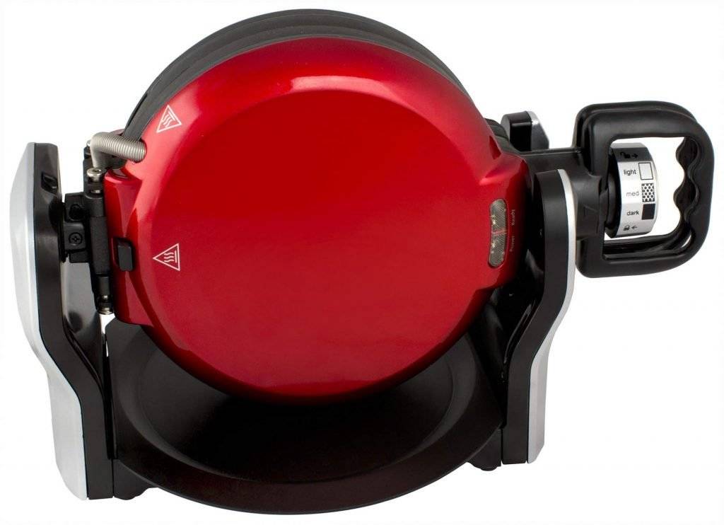 Важное достоинство этой модели – поворотность. После того, как на форму налили тесто, нужно закрыть крышку и с помощью специальной ручки перевернуть форму на 180 градусов, «вверх ногами»