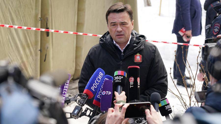 Губернатор Московской области Андрей Воробьев общается с журналистами у жилого дома на улице Зеленой в Химках, в котором произошел взрыв