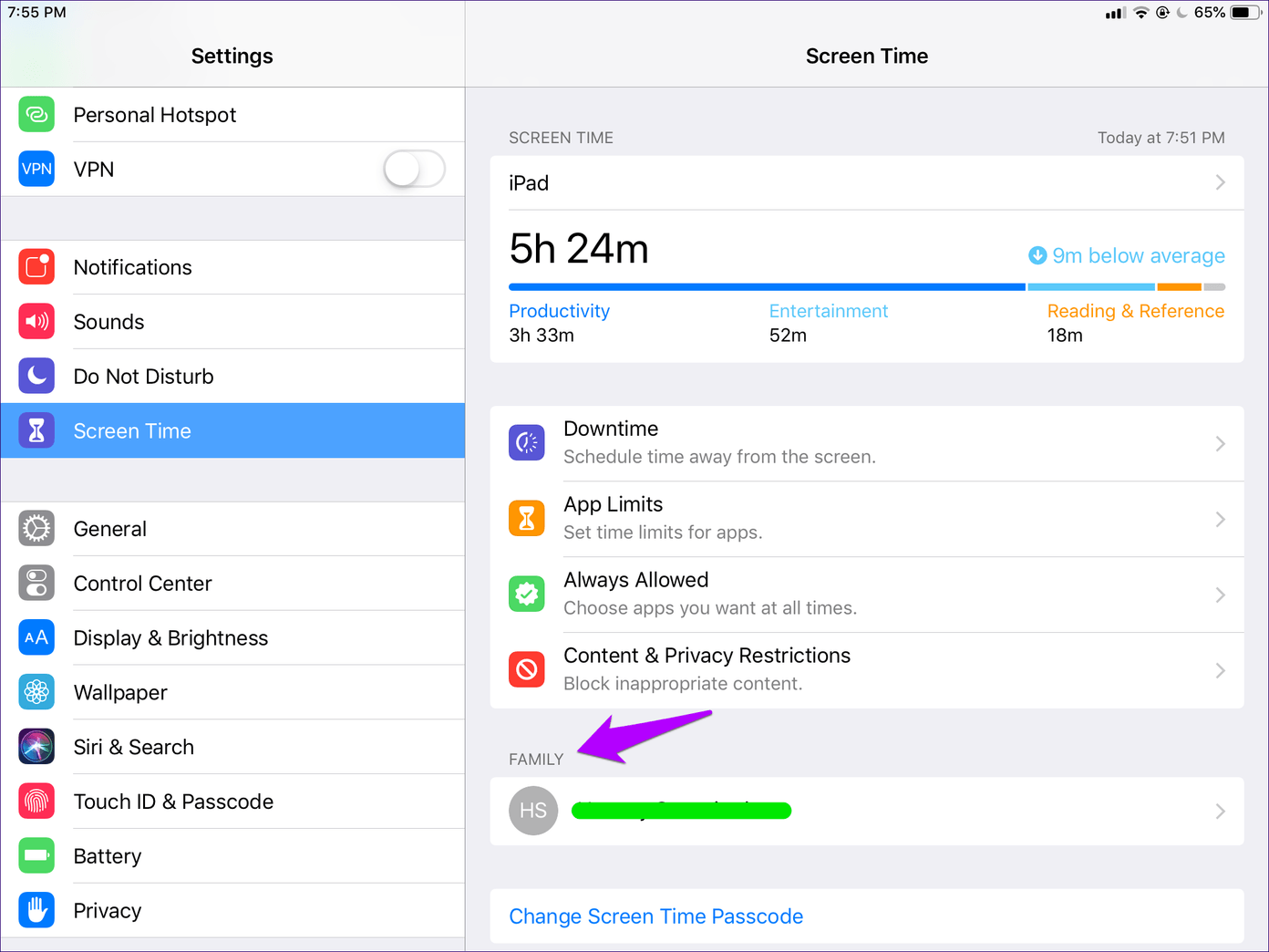 Нажмите на имя вашего ребенка в разделе «Семья», и вы увидите панель «Время экрана», напоминающую панель на вашем устройстве. Затем вы можете использовать его, чтобы заблокировать доступ к YouTube напрямую. Или вы можете ограничить количество просмотров YouTube, используя ограничения по времени. Это следует той же процедуре для почти всего.