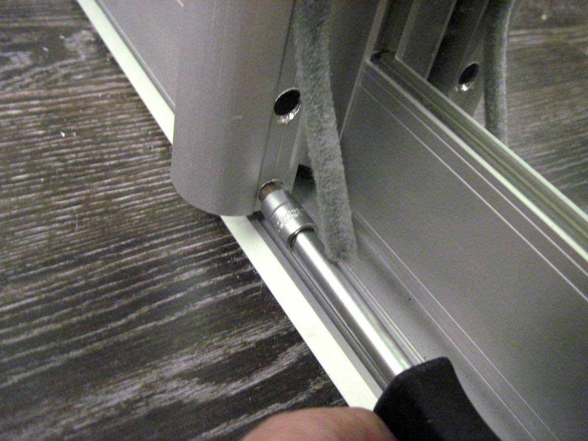 Вращая винты с обеих сторон можно отрегулировать зазор между низом двери и рельсами.