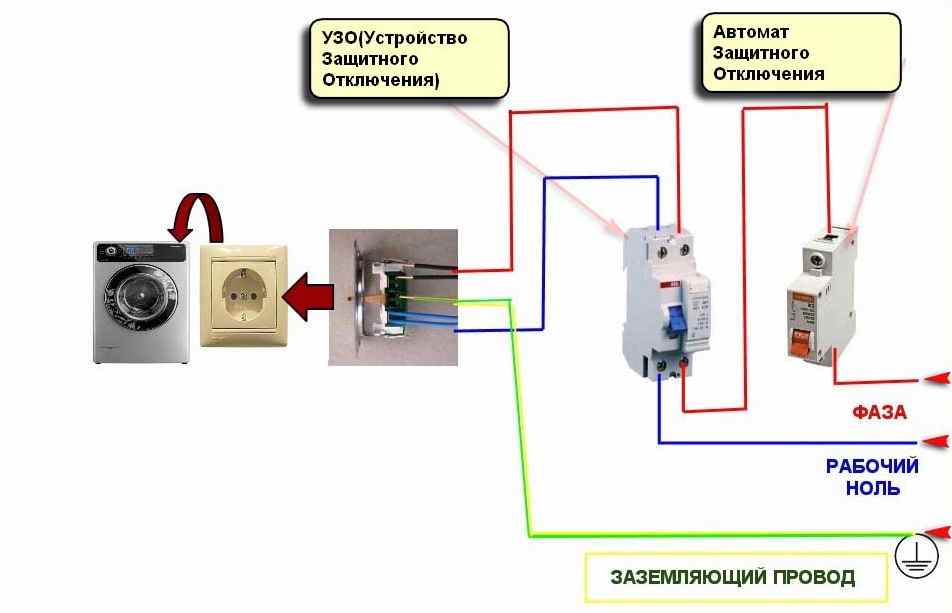- после счетчика фазный провод с красной изоляцией заходит в автомат УЗО, а с него отходит к питающей розетке стиральной машинки;