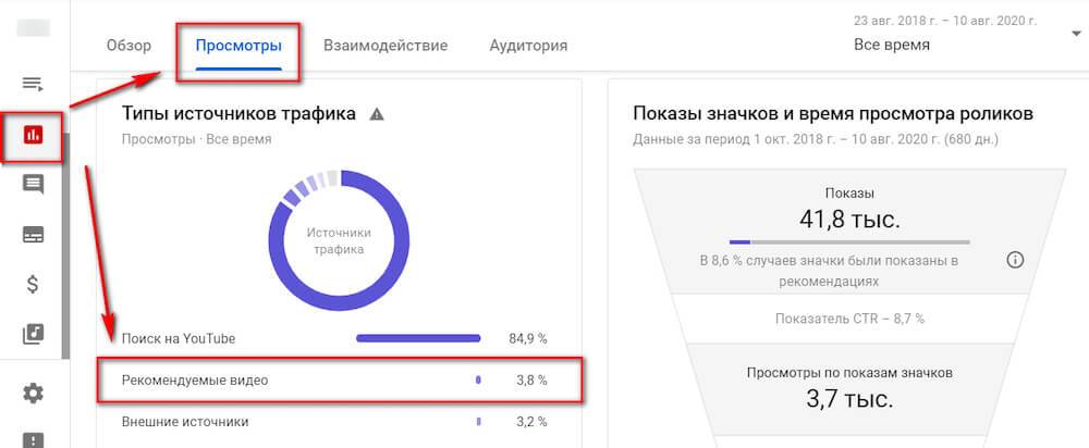 Информация находится в разделе «Аналитика», подразделе «Просмотры». В типах источника трафика есть строка «Рекомендуемые видео» — в ней показана в процентах доля зрителей, пришедших из рекомендаций.