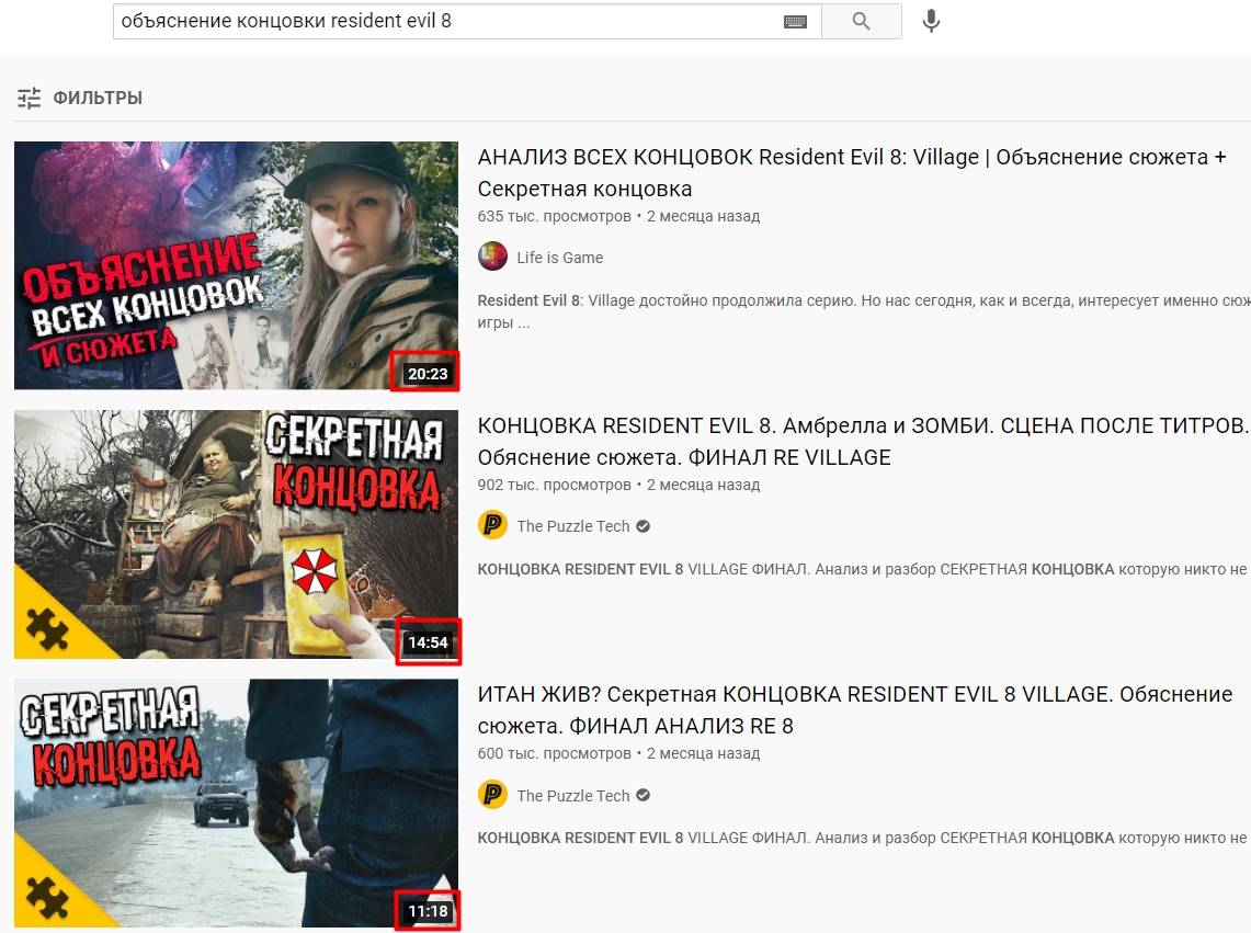Кажется, что 3-5-минутные видеоролики — лучший вариант, но все зависит от ожиданий пользователей. Пользователи с запросами «упражнения скручивание» и «объяснение концовки resident evil 8» ожидают разного уровня детализации. Несколько упражнений можно показать в коротком ролике, а для объяснения концовки может понадобиться длинный рассказ со вставками из игры.