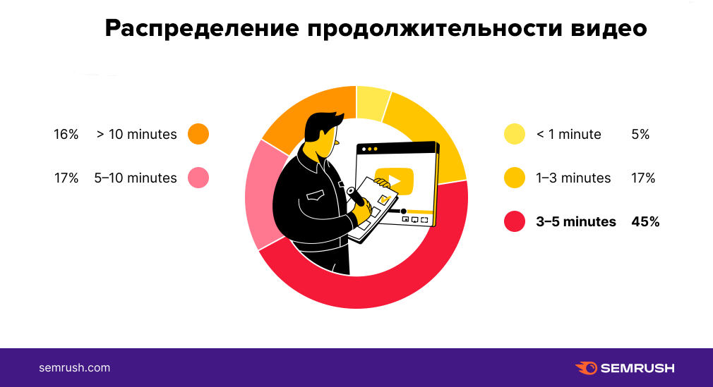 45% всех видео в топ-10 результатов поиска длятся 3-5 минут. Следующее по популярности — 1-3 или 5-10 минут. Меньше минуты всего 5% роликов.