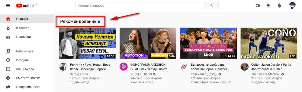 - ролики, подходящие по интересам (например, если пользователь часто смотрит видео на тему политики, YouTube будет рекомендовать ему такие видео);