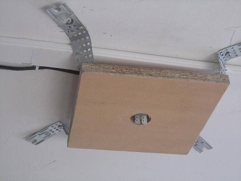 Сборка и монтаж закладных под люстру происходит аналогично. Единственное отличие — большее количество точек крепления и, соответственно, металлических подвесов. Также стоит учитывать вес люстры — для массивных изделий могут потребоваться более надежные саморезы.