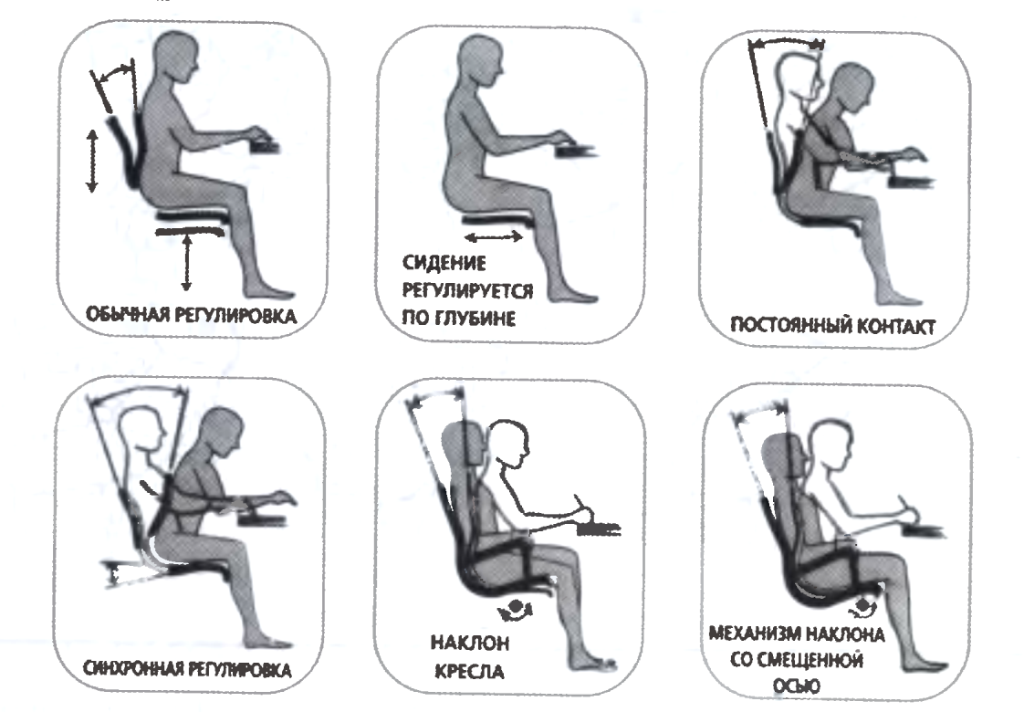 Постоянный контакт регулирует глубину сиденья в кресле, высоту и степень сгибания спины. Достоинства механизма: