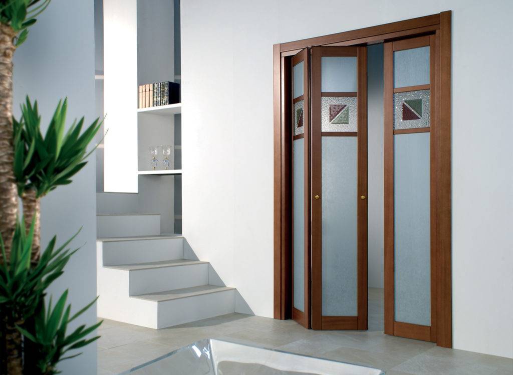 Раскладная дверь представляет сбой «гармошку» из нескольких створок. Когда нужно закрыть ее, створки поворачиваются в вертикальной оси. Это нечто среднее между раздвижной и распашной конструкцией. Используют их преимущественно в широких проемах.