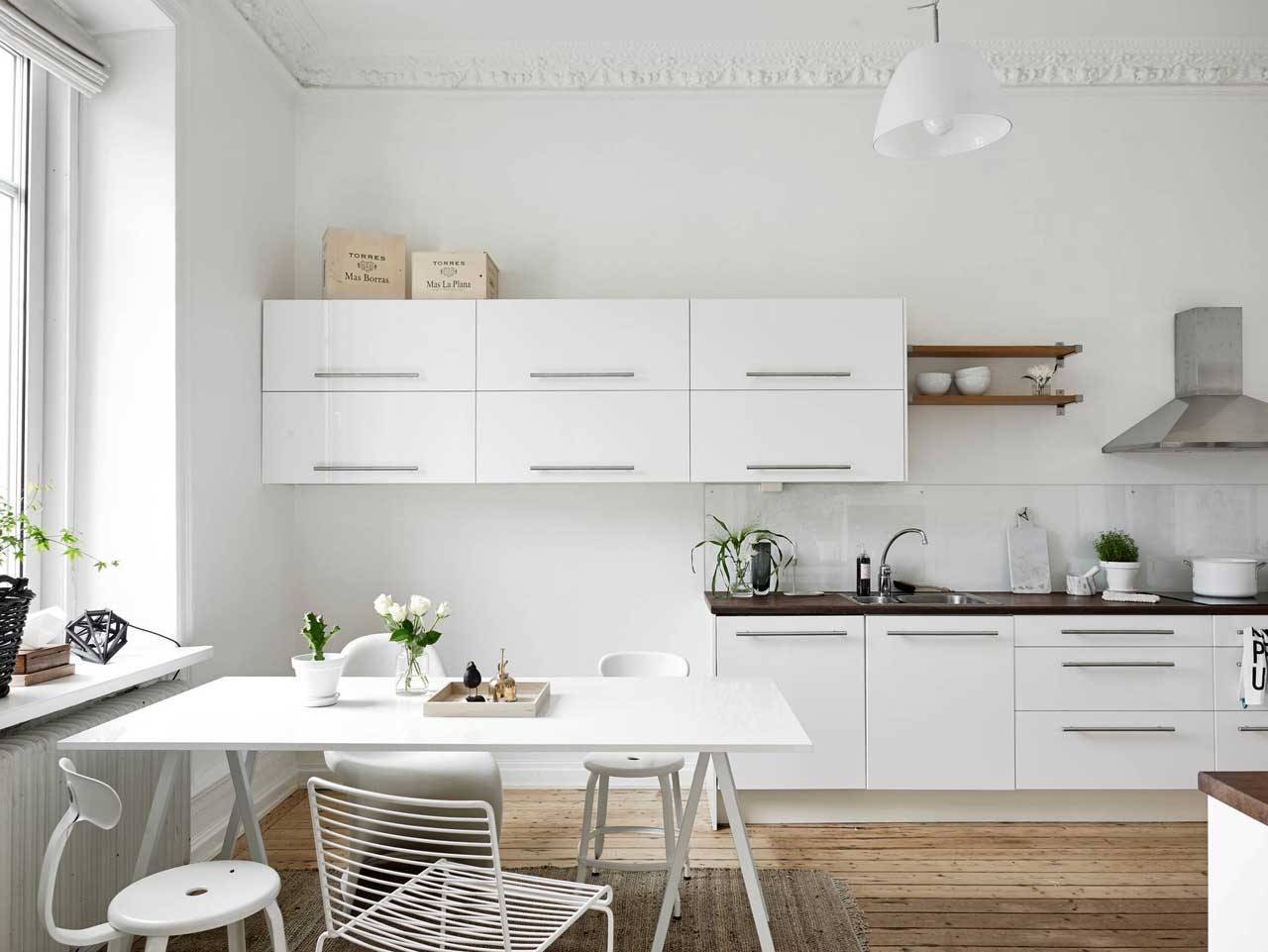 Белоснежный интерьер сочетается с полами любого цвета, кроме чрезмерно ярких.