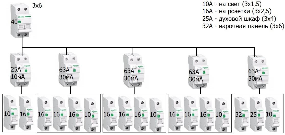 Каждую электрическую сеть в квартире или доме можно условно поделить на участки (помещения). В зависимости от того, какие приборы планируется использовать на том или ином участке делается расчёт электропроводки. Обычно зоны электропроводки для каждого автомата разделены между собой на каждое помещение квартиры или дома. Один участок проводки на одну комнату, второй на другую, а третий на кухню и ванную комнату. Особняком в данной ситуации стоят такие мощные потребители как электроплитки, духовые шкафы, водонагреватели, котлы отопления. Такая техника требует выделенной линии питания, поэтому в современных домах, предназначенных для использования с электрическими плитами, для обеспечения питания прибора выведен отдельный автоматический выключатель.