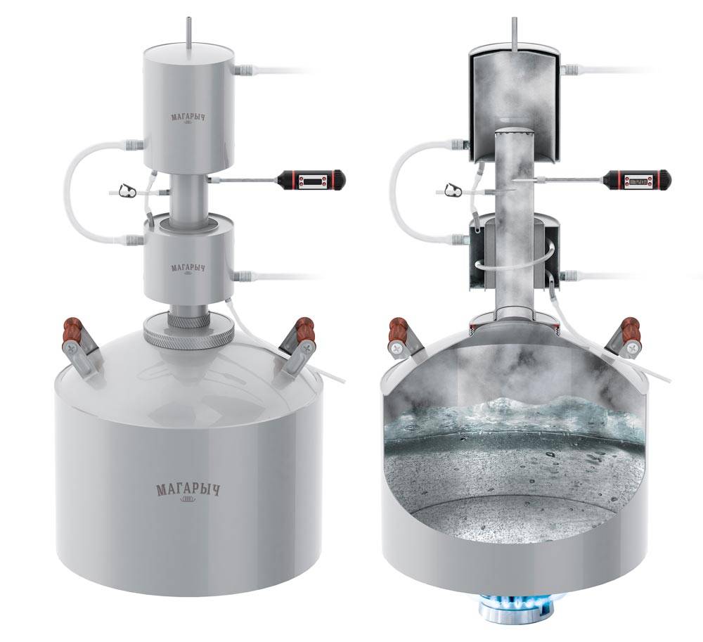 Это классические конструкции, которые подходят как для коммерческого, так и для домашнего использования. Они стоят дороже моделей с сухопарником, но в то же время позволяют создать мини-завод для производства чистого спирта-сырца, получаемого при перегонке браги. В идеале здесь должен быть термометр, спиртометр, дефлегматор, которые гарантируют высокую степень очистки спирта.