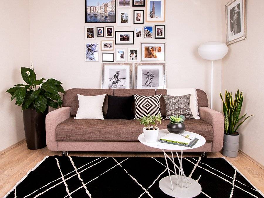 2. Под цвет мебели, но наоборот. Белизну дивана подчеркнет черный ковер, а теплоту бежевой кровати — темно-коричневый. То есть данная схема подразумевает использование ковра, цвет которого прямо противоположен цвету мебели, расположенной рядом с ним.