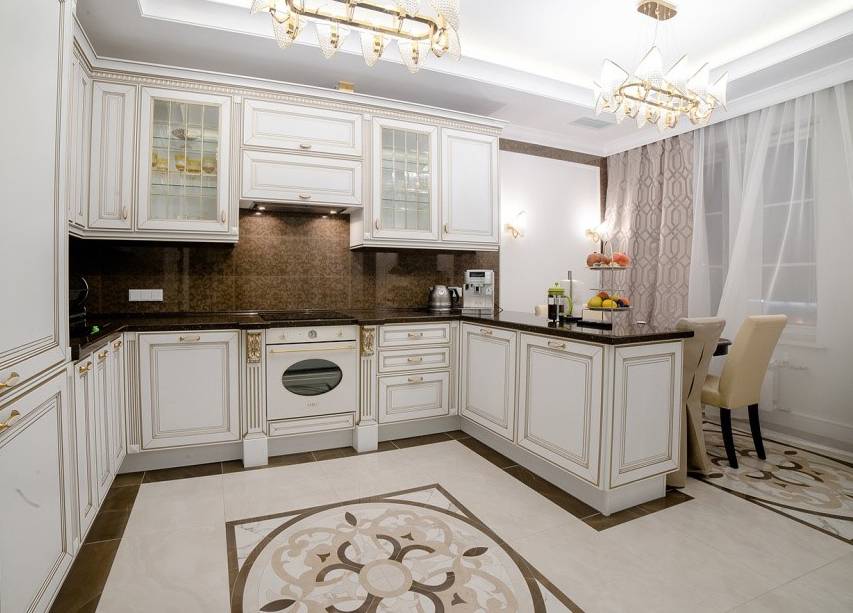Отдайте предпочтение бежевым, коричневым коврам. Смелым решением для кухни в классическом стиле может стать белый ковер.