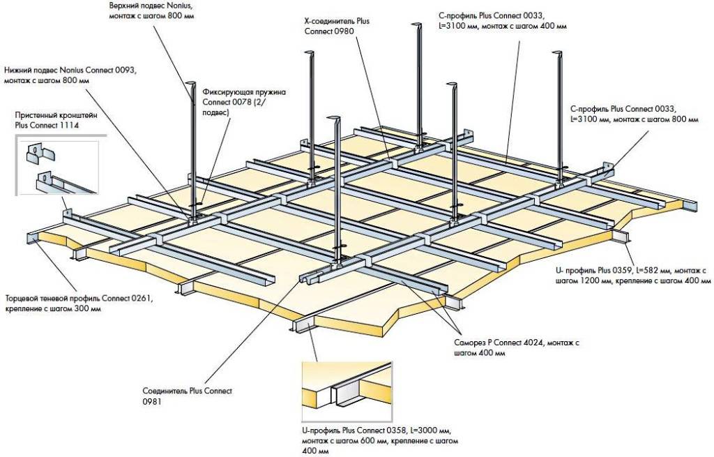 При этом в обоих случаях изоляционный материал нужно крепить на независимых подвесах так, чтобы он не опирался на поверхность фальш-потолка. Выпускаются гипсокартонные плиты, на которых уже укреплен толстый слой полистиреновой пены. В этом случае при монтаже следует учесть запас прочности несущего профиля, поскольку вес такого композитного материала увеличится.