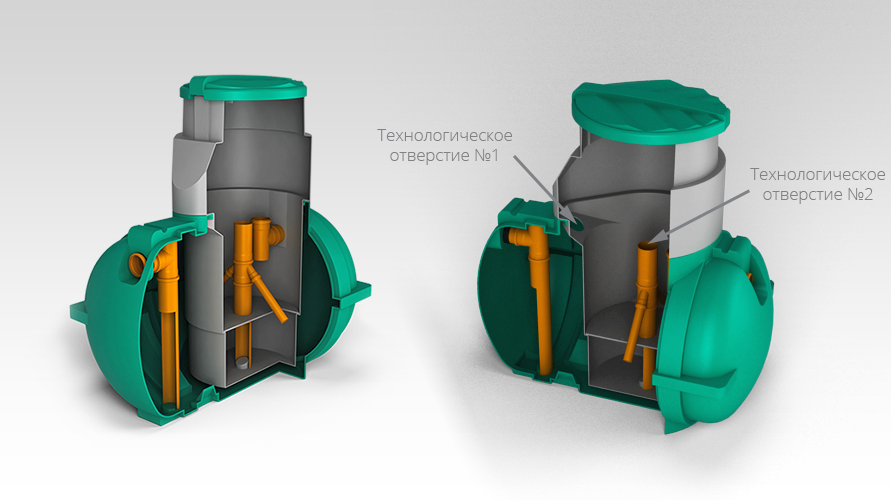 Все рассматриваемые далее очистные установки выполнены из пластика, гарантирующего срок службы корпуса до полувека. По умолчанию все процессы перелива стоков в них происходят самотеком, но возможен и вариант монтажа дренажного насоса для выкачки очищенной воды.