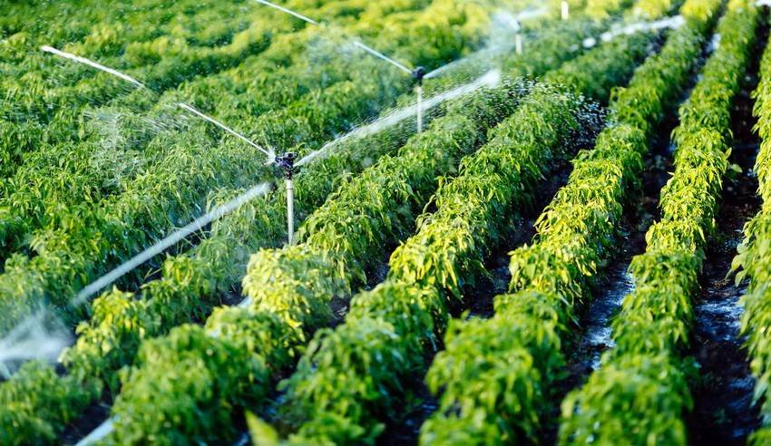 Полив дождеванием часто используют для газонов и длинных грядок.