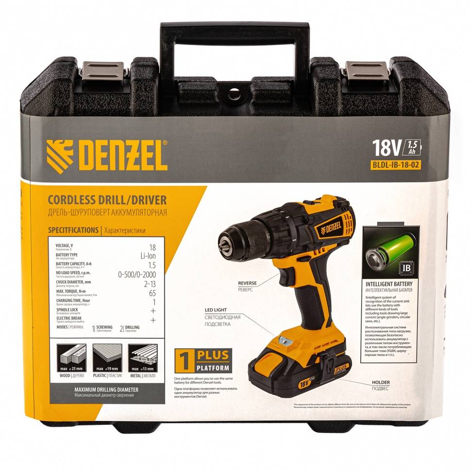 Модель Denzel BLDL-IB 18-02 прочная и качественная, оснащена бесщеточным двигателем, ресурс которого увеличен. Из особенностей данного агрегата, можно выделить наличие подсветки рабочей зоны, индикатора заряда, а также защиты от полной разрядки и нежелательного перезаряда. Производители установили электрический тормоз и регулятор частоты вращения. Само изделие имеет усиленную конструкцию и идет в комплекте с двумя батареями, кейсом, зарядным устройством и другими аксессуарами необходимыми для работы.