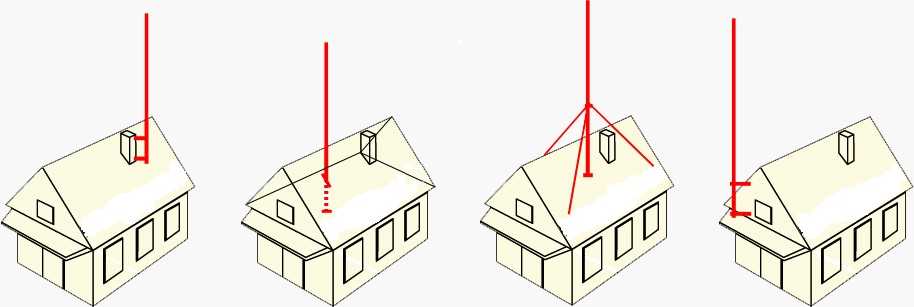 Чаще всего встречается крепление антенны на фронтоне. Оно реализуется проще всего, но только в том случае, если отделка или материал стен позволяет. Так не крепят на стенах, обшитых сайдингом, и на стенах из газобетона — слишком сложно. Тогда вариант — закрепить штангу к трубе, к стропилам, или на растяжках к кровельному материалу.