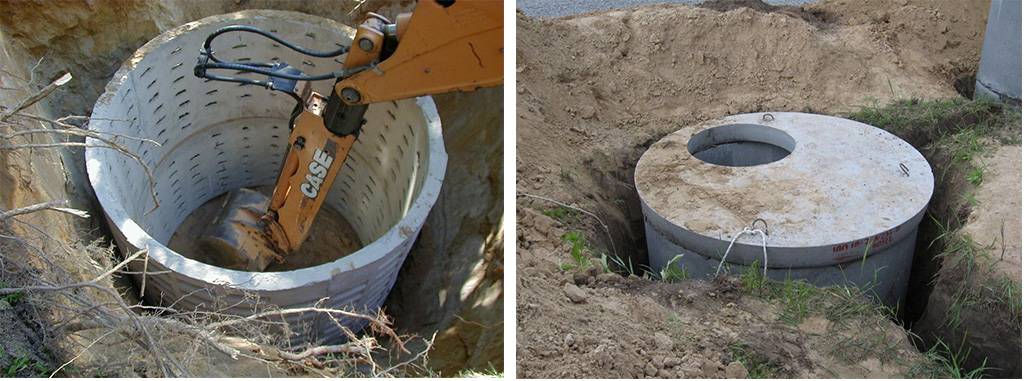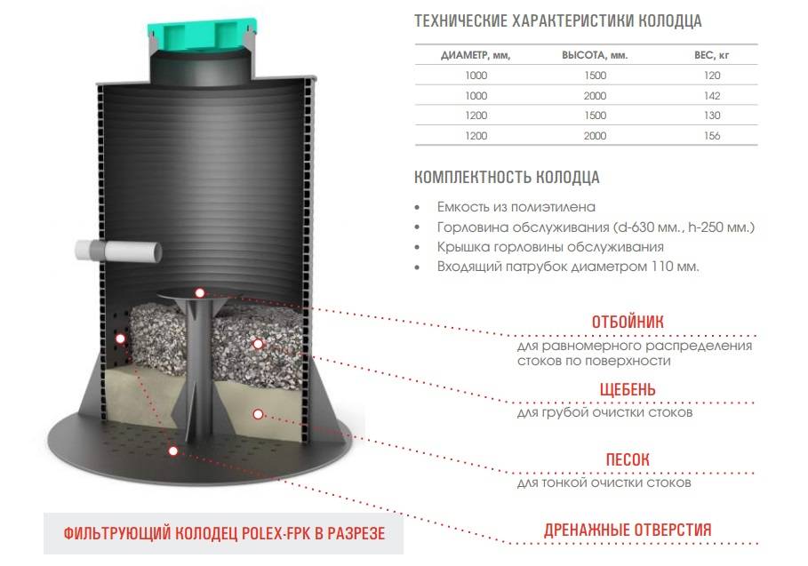 Особенность фильтрационного колодца – способность очищать стоки за счет деятельности почвенных микроорганизмов. Объемы стоков при этом ограничены (1 м3 в сутки), сам колодец размещают не ближе 5 м к жилому дому.