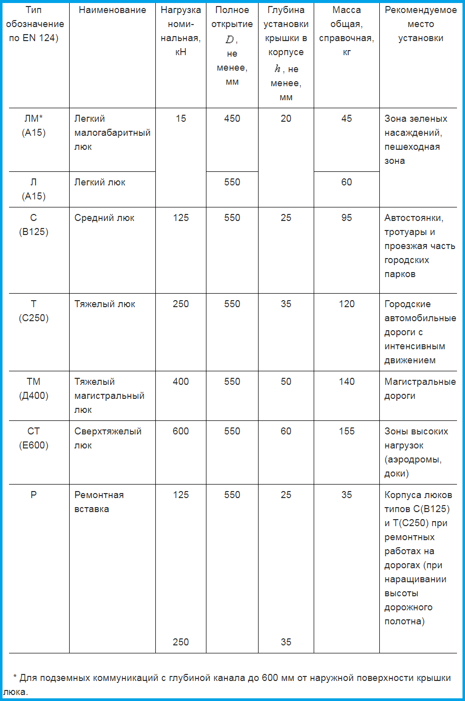 Чугунные. Традиционные люки из толстого и прочного металла со сроком службы до 80 лет, недостатками которых являются высокая стоимость и соответственно повышенный риск кражи «копейки». На изготовленные в заводских условиях люки из чугуна распространяется ГОСТ 3634-99, разделяющий изделия на несколько категорий по массе, наружному диаметру крышки и обечайки (кольца), глубине установки и выдерживаемым нагрузкам. Стандартный диаметр лаза всех изделий составляет 550 мм, масса колеблется от 45 до 150 кг, номинальная нагрузка самого прочного люка достигает 6000 кг (600 кН).