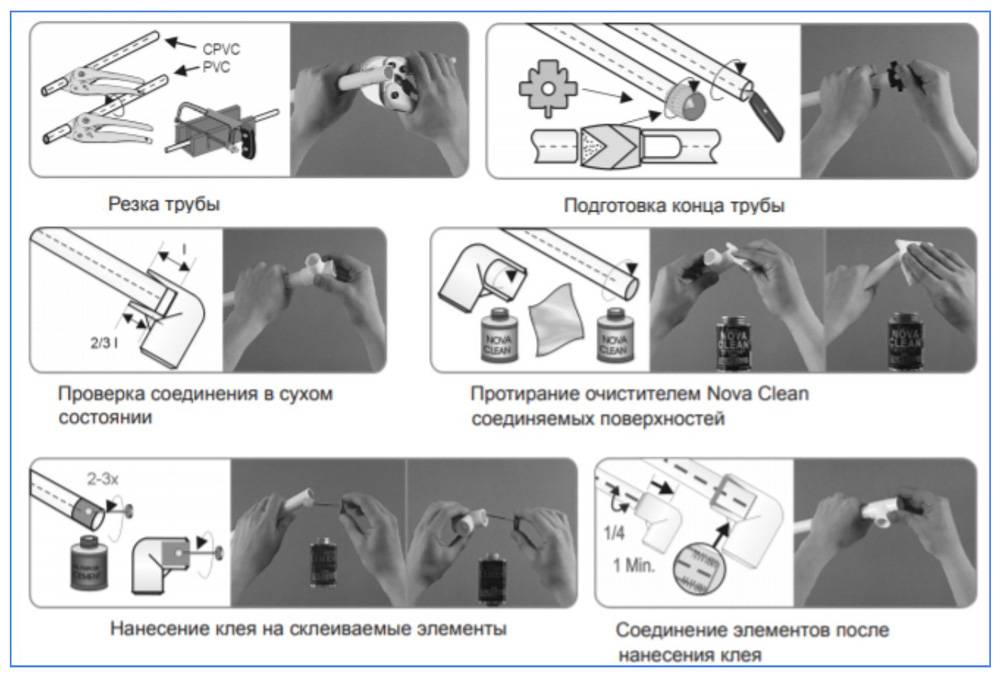 Инструкция по монтажу ПВХ-трубопровода на клеевой состав состоит из следующих пунктов: