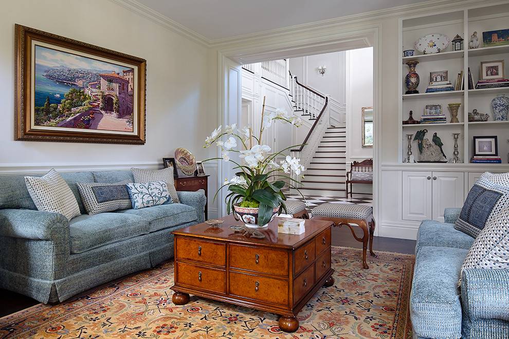 Для гостиной в колониальном стиле необходима основа обустройства — напольное покрытие и материал для отделки стен. Вы можете расположить на полу темные деревянные доски, но если комната небольшая, подойдут и светлые доски, например, расположенные в виде квадратов или тройной диагональной ели.