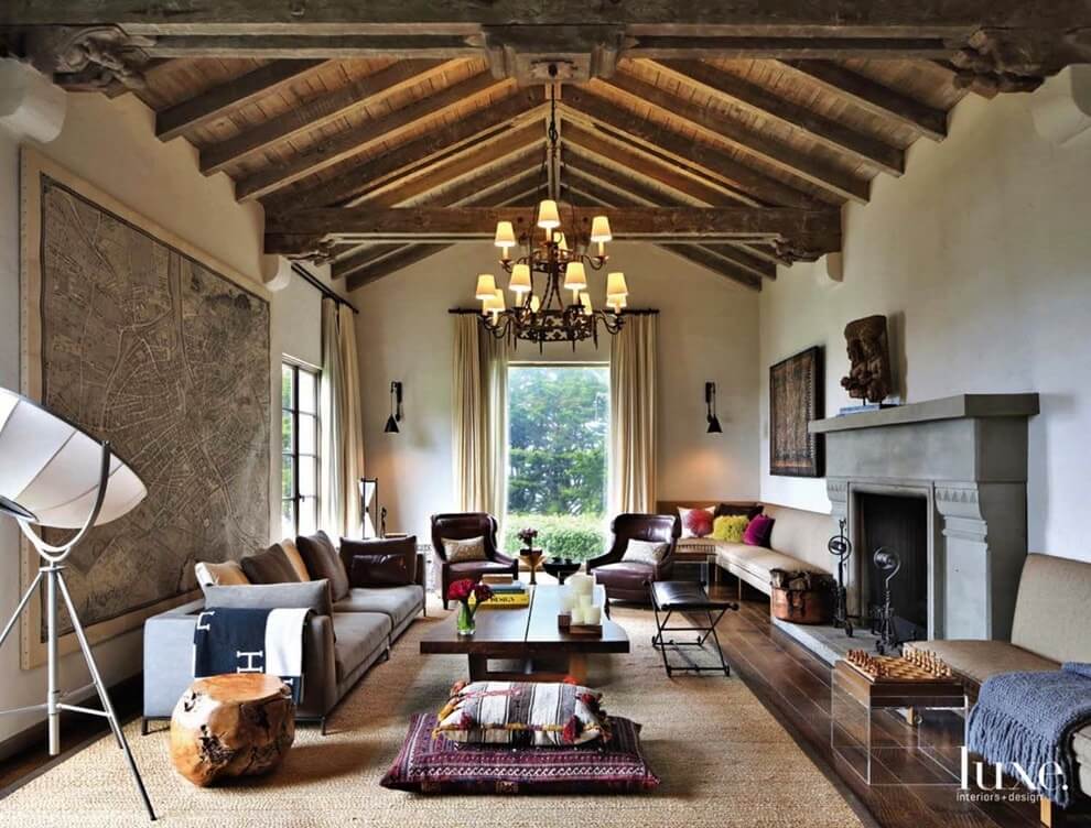 Деревянные балки на потолке, большие окна, ковер с восточными элементами в интерьере гостиной