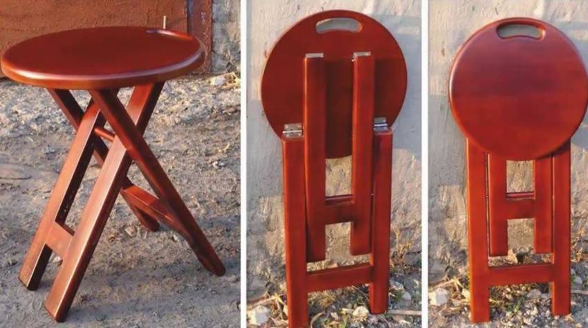 - Складные табуреты более функциональны. Однако изделие имеет значительные габариты. Ножки раздвигаются довольно широко, чтобы обеспечить хорошую устойчивость.