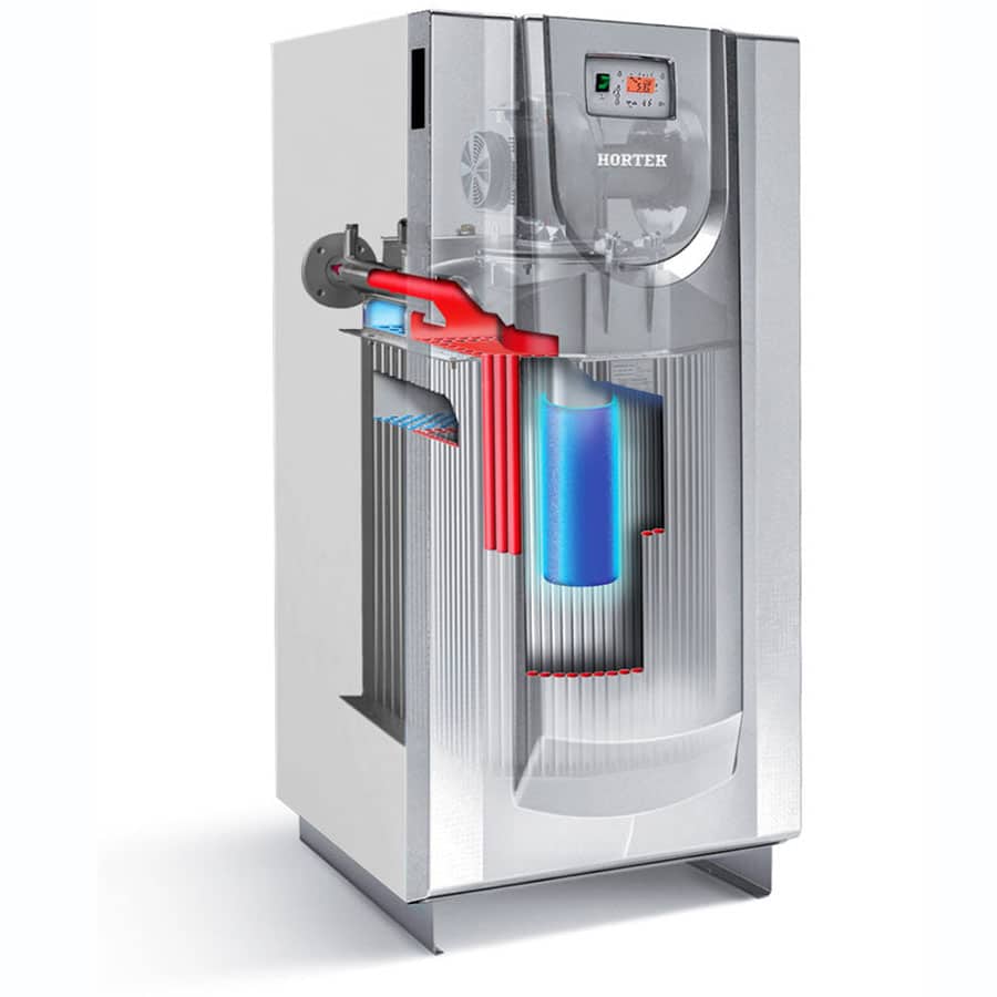 - Вторичный (конденсационный) теплообменник. Расположен в камере доохлаждения. Снабжён конденсатором, на стенках которого из паров образуется конденсат и аккумулируется выделяемое тепло. Изготавливается литым из стойких к агрессивной среде нержавеющей стали и силумина (сплав алюминия с кремнием).