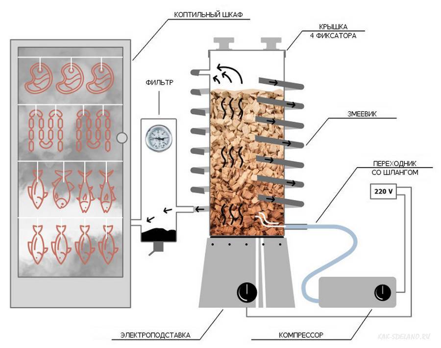 Опилки укладывают в емкость и разжигают через нижний клапан. Дым, проходя по трубке, частично очищается и подается в коптильную камеру. Движение газов активизируется с помощью компрессора.