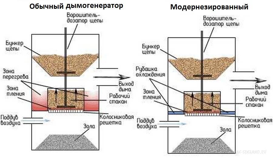 В нижней части емкости размещается колосник для щепы, пространство под ним используется для накопления золы. Доступ нужного для горения воздуха осуществляется через нижнее отверстие с заслонкой.