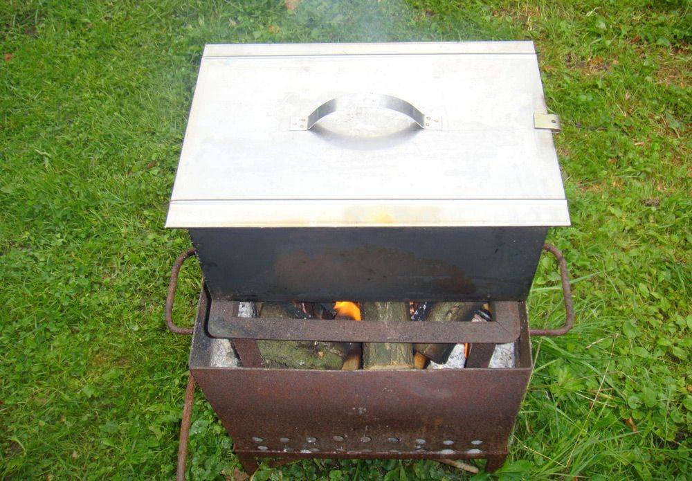 - Переносные походные коптильни, подобно туристическим мангалам, изготовлены в форме ящика из толстостенной нержавеющей стали. Устанавливаются на подготовленный очаг — углубление в земле или кирпичную надстройку, в которой будет поддерживаться огонь, нагревающий коптильню. Легки и удобны в применении; это один из наиболее популярных видов коптилен горячего копчения. Недостатком может служить только их компактный размер, не позволяющий приготовить большое количество продукции за один раз.