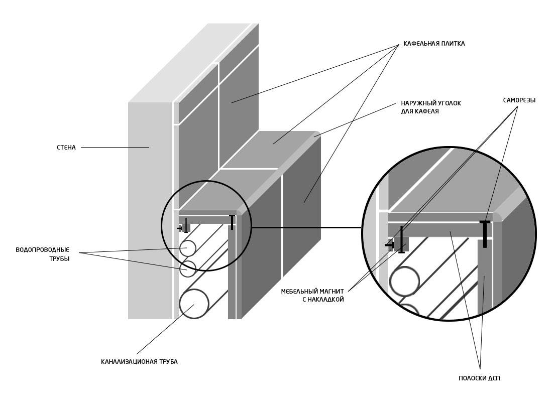 Строится каркас, под которым располагаются трубы. Конструкция оформляется керамической плиткой. При этом обязательно выполняется ревизионный люк или несколько, в зависимости от протяженности трубопровода. Форма каркаса и его расположение могут быть любыми, их определяет желание владельца. Чаще всего конструкция подходит к мебели или к сантехническим приборам.