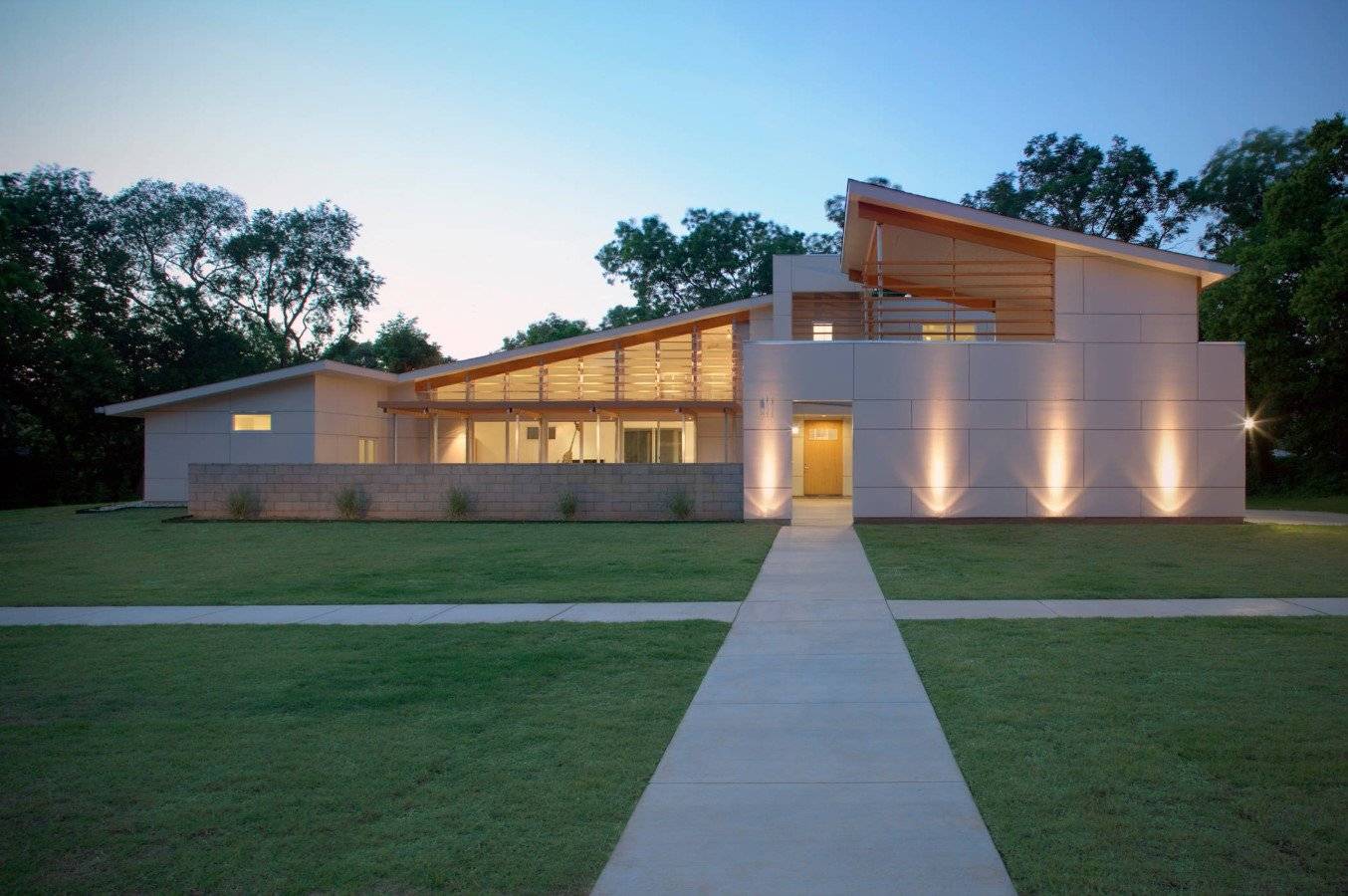 Акцент на использование актуальных конструктивных, строительных и отделочных решений. Для фасадов подходят штукатурка, керамогранит, дерево, облицовочный кирпич, фиброцементные панели из модных коллекций производителей.