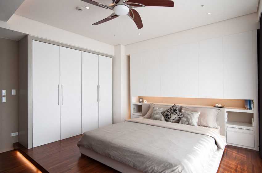В случае использования белого цвета в качестве основного при отделке стен и потолка удачным вариантом станет размещение в спальне темной мебели.