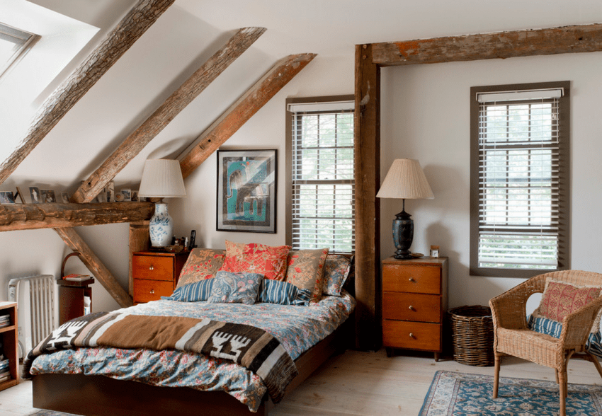 Для тех, кто не хочет слишком менять стандартное расположение, традиционным местом станет комната на втором этаже. Подобная дислокация поможет максимально избавить спальню от звуков с улицы или запахов кухни. Спальня на втором этаже станет более теплым помещением, чем комната, расположенная внизу.