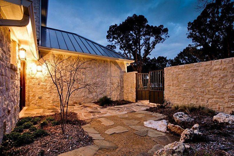 Каменное ограждение – основательный и презентабельный вариант. Долговечный материал сохраняет свое качество на протяжении долгих лет службы. Он замечательно гармонирует с каменной облицовкой всего здания или его основания.
