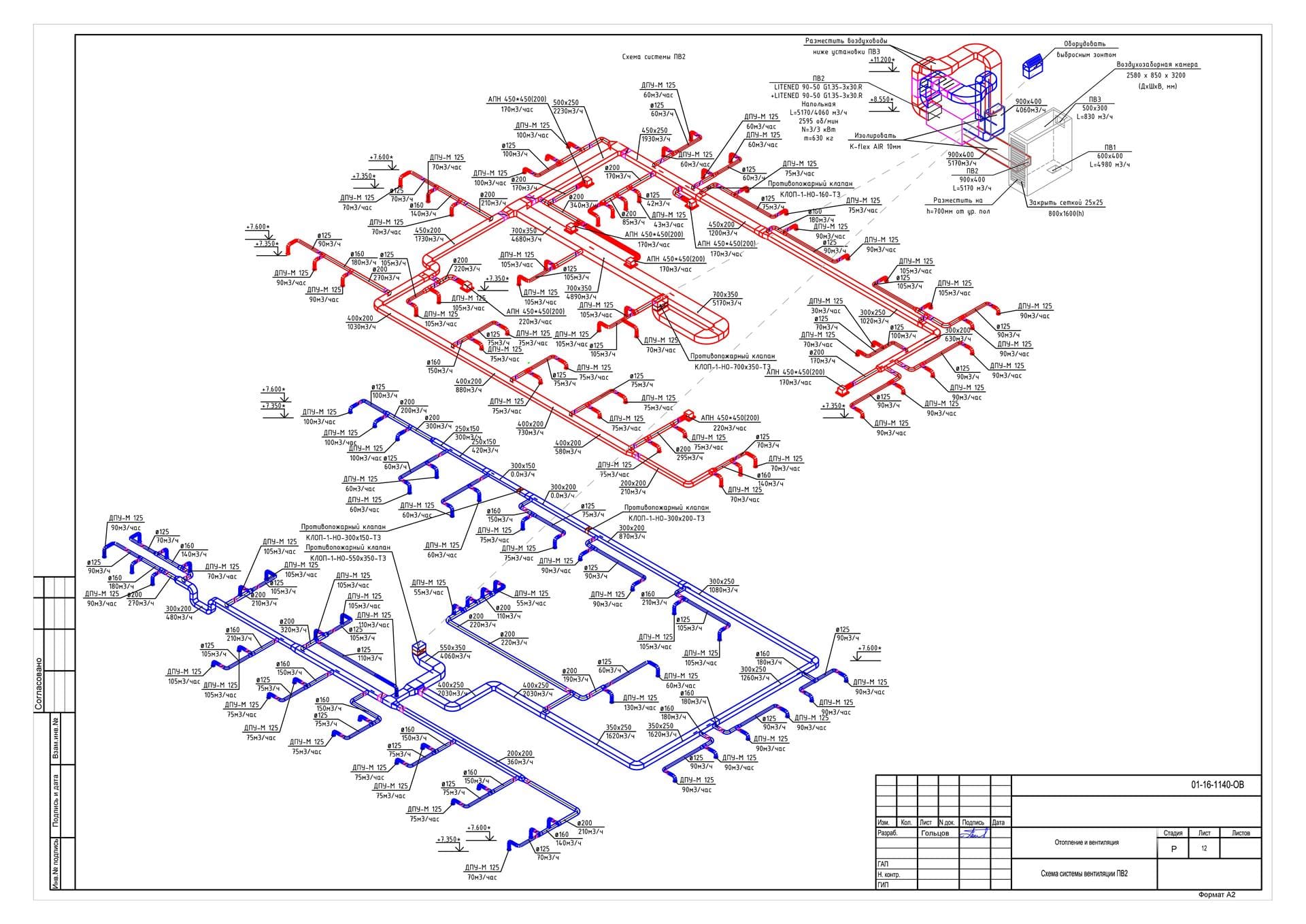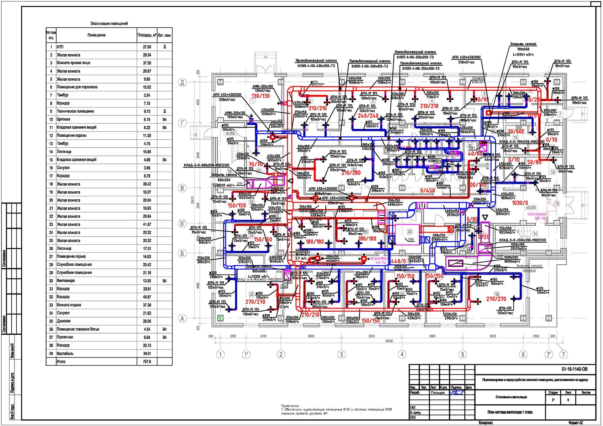 Ключевые листы проектной документации. По ним выполняются монтажные работы, согласование инженерных систем и последующее сервисное обслуживание. На планах показывают трассировки воздуховодов, их размеры, расходы воздуха на каждом участке, марки решеток и вентиляционного оборудования.