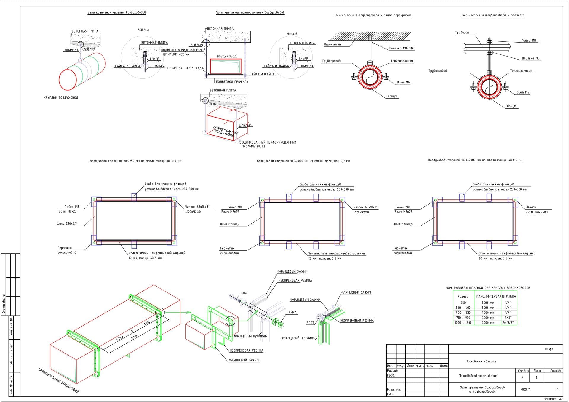 Стандартные элементы любого проекта. Воздуховоды разного размера и конфигурации крепятся по-разному. Крепежные элементы дополнительно заказываются монтажной организацией и должны строго соответствовать указанным в проекте требованиям.
