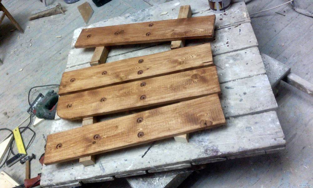 4. Далее необходимо прикрутить ножки. Здесь используются прямоугольные дощечки, которые соответствуют дизайну кровати.