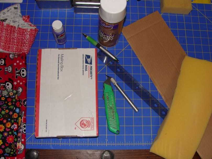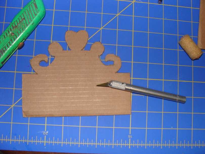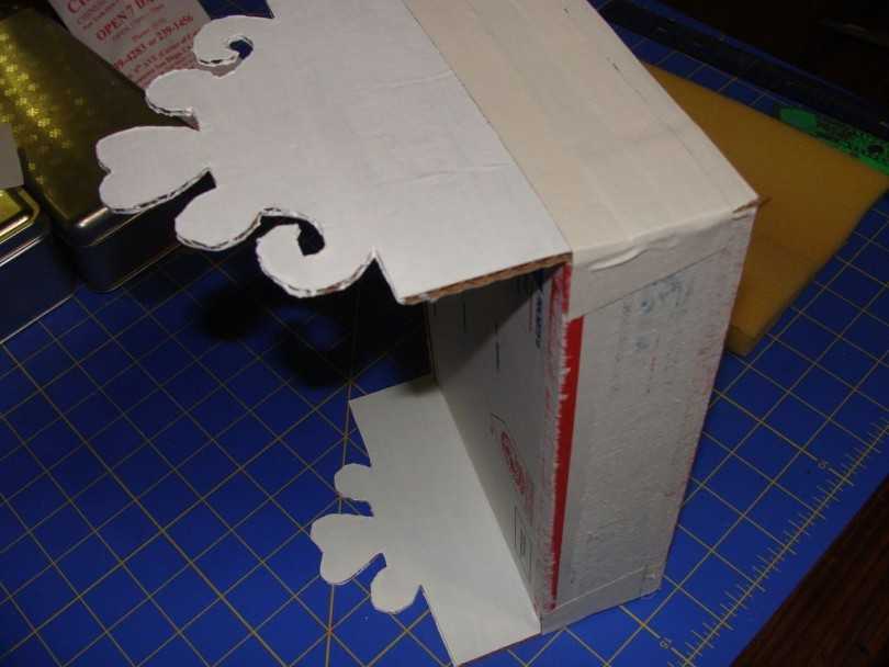 Затем разрежем прямоугольник самого короба по углам сверху вниз на две трети. Одну сторону коробки, которая станет изголовьем ложа, можно оставить без изменений по высоте. Боковые стенки уменьшим, срезав одну треть бортика.