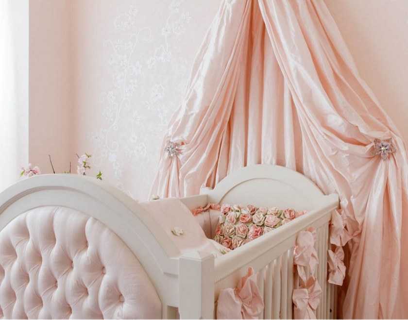Веревку продевают в кольца и подвешивают кроватку к потолочному анкерному болту. Из легкой прозрачной ткани делается навес по линии натянутых веревок, и крепят скобами по трем сторонам кроватки.