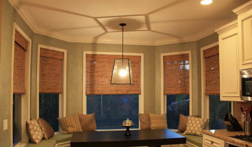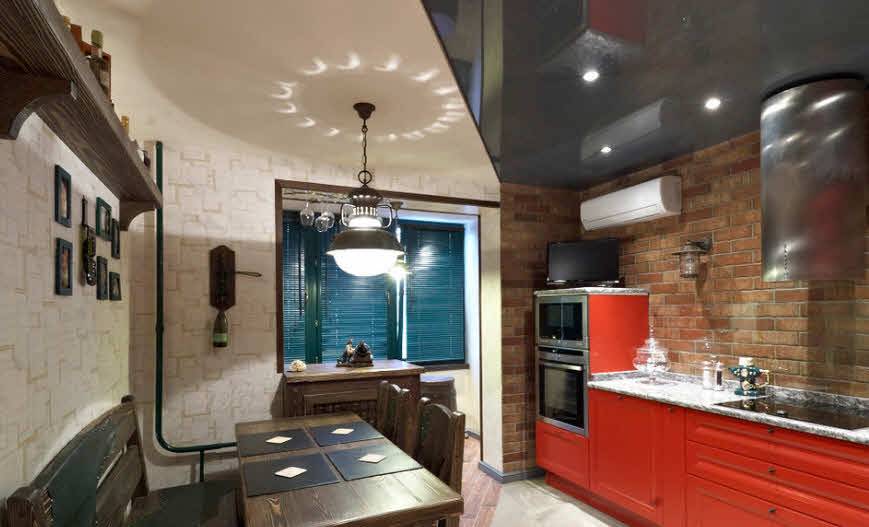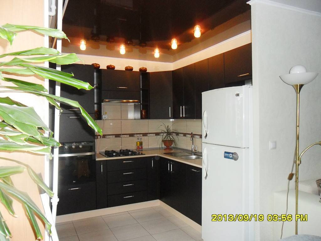 При этом перепады уровней не должны быть большими. Стык потолка и стен следует украсить потолочными плинтусами из полиуретана или гипса. Накладные элементы в виде лепнины можно использовать, если помещение кухни просторное, а сами потолки — высокие.