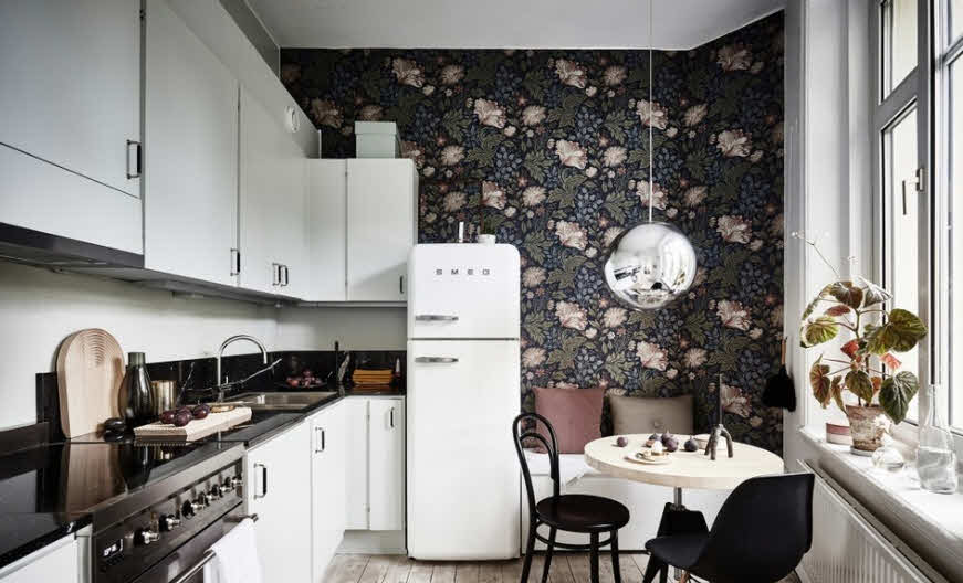 В классическом интерьере органично выглядят обои, либо текстильная отделка, однако в условиях кухни такие материалы крайне непрактичны. Прекрасный выход из ситуации — использование моющихся обоев с шелковистой структурой, геометрическим либо растительным орнаментом.