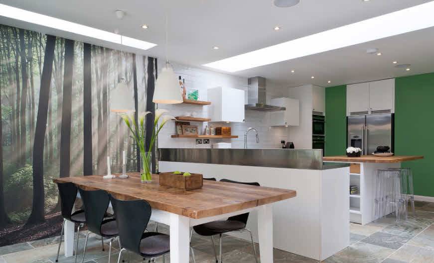 Способ №1 для отделки стен в настоящее время. Обои представлены в невообразимом количестве цветовых гамм и оттенков. Флизелиновые, виниловые, стекловолоконные виды легко применимы в «суровых» условиях кухни. Легко моются, при этом нет необходимости идеального выравнивания стен перед поклейкой обоев. Фотообои могут любую стену сделать акцентной, погружая Вас и ваших гостей н балкон с видом у моря и осенний лес.
