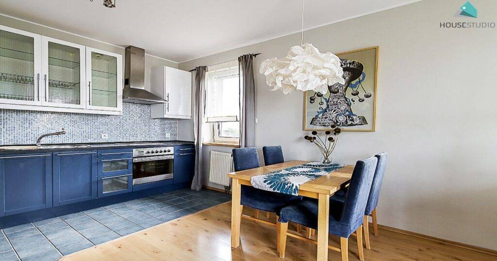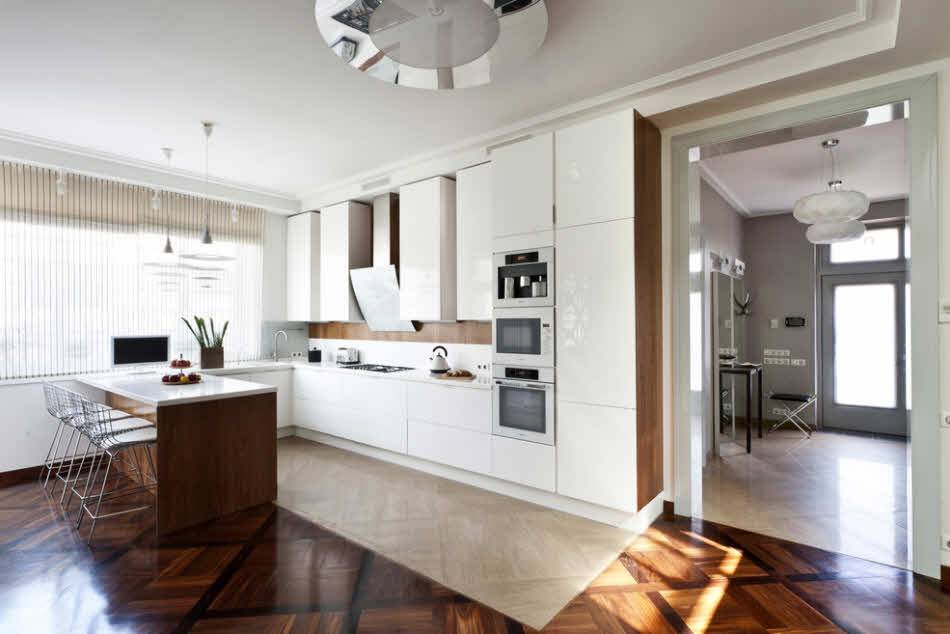 В идеале, он должен быть деревянным (это могут быть широкие доски, либо паркет). Однако в реальности такой вариант не всем доступен, кроме того, он не особо практичен именно для кухни. По этой причине разрешено использовать качественный ламинат, максимально реалистично выполненный под натуральное дерево.