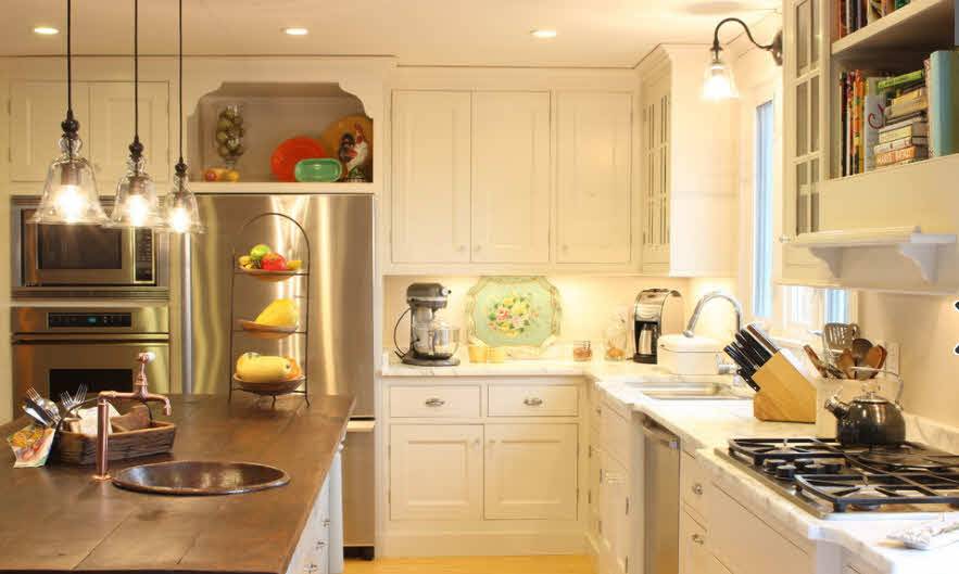 Внутренняя отделка кухни напоминает комнату для приема гостей. Стены окрашивают матовой краской в светлые оттенки или оклеивают обоями с имитацией плотной ткани. В качестве орнамента допускается клетка, полоска или цветы, в основном розы. Для настенного покрытия рекомендуется использовать вместо обоев панели из дерева.