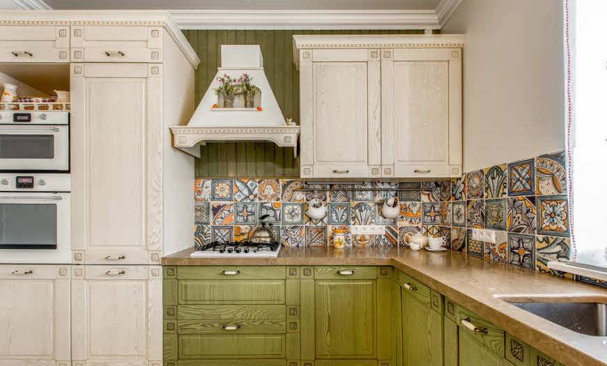 Если кухня маленькая, то можно ограничиться лишь некоторыми деталями. Интерьер предусматривает использование исключительно натурального материала, например дерева классических пород или камня.